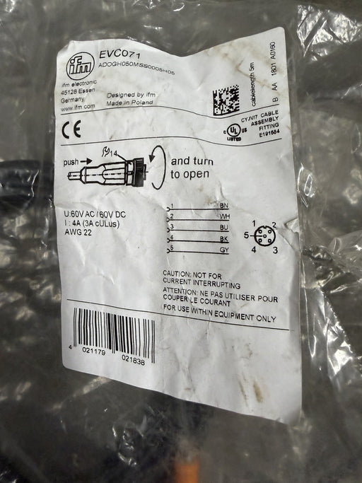 Ifm evc071 cordset, 5pin cable 5m 4a max